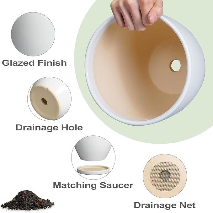 - Plant Pots with Drainage Holes and Saucers: The drainage holes can effectively remove excess water from the ceramic planter to avoid root rot; while the ceramic plant tray can catch excess water seeping out from the bottom of the ceramic flower pot to keep the home environment tidy