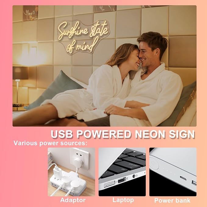 - Adjustable Brightness: Whether creating a romantic dinner atmosphere or a lively party vibe, our Sunshine State of Mind neon sign adds a charming glow to your setting. With its brightness adjustment feature, you can effortlessly control the softness or brightness of the light, making it for any occasion