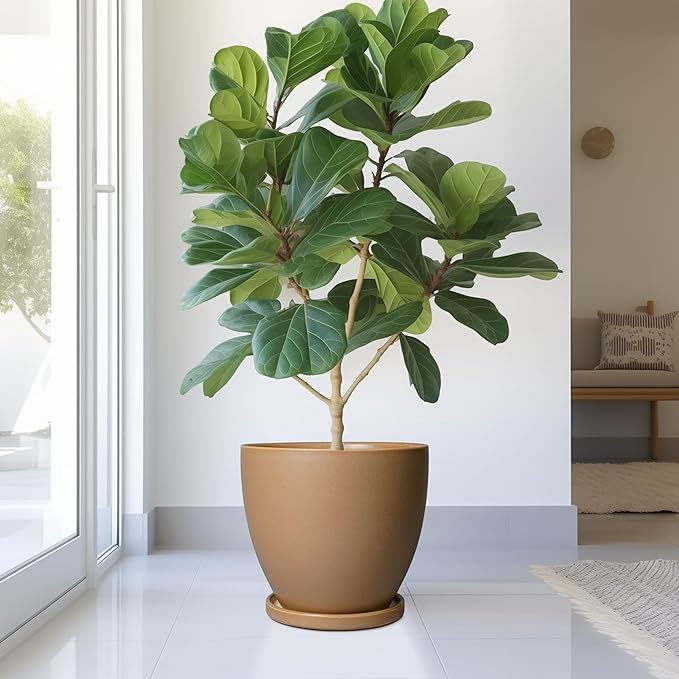 10 Inch Planter - Ceramic Pots for Plants, Planters with Drainage Hole and Tray, Modern Flower Pots Indoor, Home Living Room Patio Porch Garden Office Decor, Brown