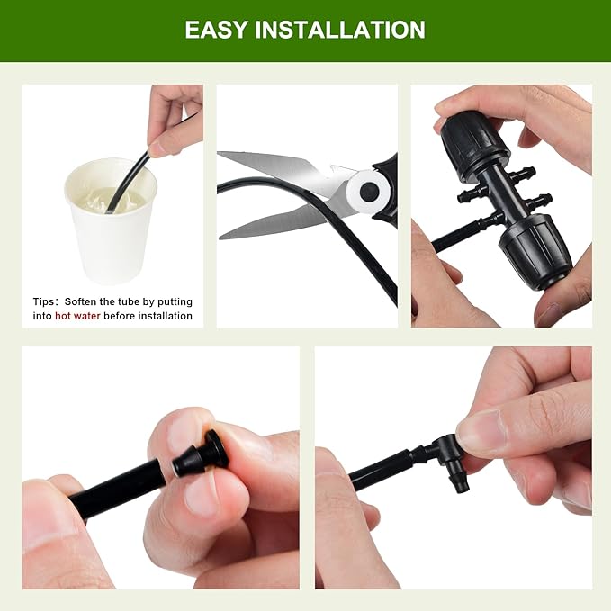 - Durability & Flexibility: Put the tube into a cup of hot water for 10 seconds before assembling. Connect with most 1/4-inch irrigation drippers, drip irrigation emitters or drip irrigation parts. Material light, good toughness,can be very good to save other pipe fittings. Suitable for small, dense planting areas and areas with many bends
