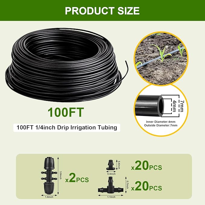 - Perfect Size: This drip irrigation hose designed with an inner diameter of 4mm and outer diameter of 7mm, this 1/4" drip irrigation tube is thick (3mm) and offers double explosion-proof protection to prevent accidental leaks or bursts due to pressure changes.It is suitable for year-round use in any weather condition