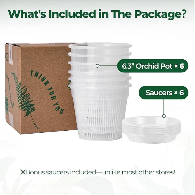 - Special Feature : Bonus saucers included, hassle-free gardening at its best!, Holes for 360° airflow, banishing root rot for thriving orchids!, Get 6 pack slightly larger than 6 inch clear orchid pots with matching saucers, Transparent design, keeping root health in clear sight! Bonus saucers included, hassle-free gardening at its best!, Holes for 360° airflow, banishing root rot for thriving orchids!, Get 6 pack slightly larger than 6 inch clear orchi… See more