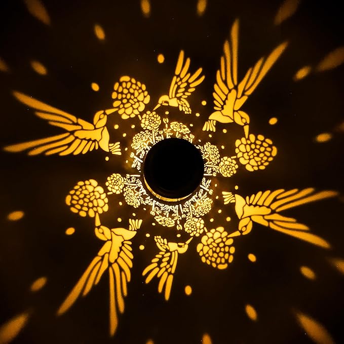 - Charming Solar Garden Decoration: Enhance your garden with this stunning hummingbird solar lantern. Featuring an intricate retro design with a gold-copper finish and hollow metal veneer, it casts warm, inviting light while creating beautiful hummingbird patterns. Perfect for gardens, patios, walkways, and porches, this elegant lantern blends beauty with functionality, enhancing any outdoor environment with a graceful, atmospheric glow.