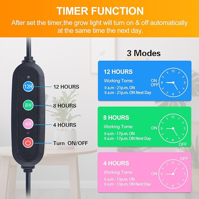 - Auto ON/OFF Every Day---4/8/12 Hr Timer. The plant grow light will auto ON/OFF every day. You can be easy to use this floor lamp grow light for tall houseplants, seed starting, seedlings, flowering.