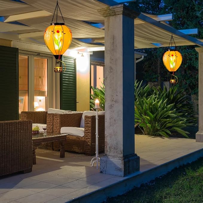 - 【Hanging Solar Light with Flickering Flame】The glass hot air balloon solar lantern with metal "S" hooks can be easily hung anywhere, such as balconies, porches, ledges or trees. The bright hot air balloon decorations during the day can add color to your outdoor space, and at night to add a warm and romantic atmosphere to your homeland.