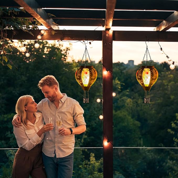 - 【Weather Resistance】This hanging hot air balloon solar lantern is 18.1"H and is mainly made of high qualty glass and metal materials. Outdoor hot air balloon solar lantern with protective coating, waterproof, rust and other characteristics, can adapt to a variety of weather.