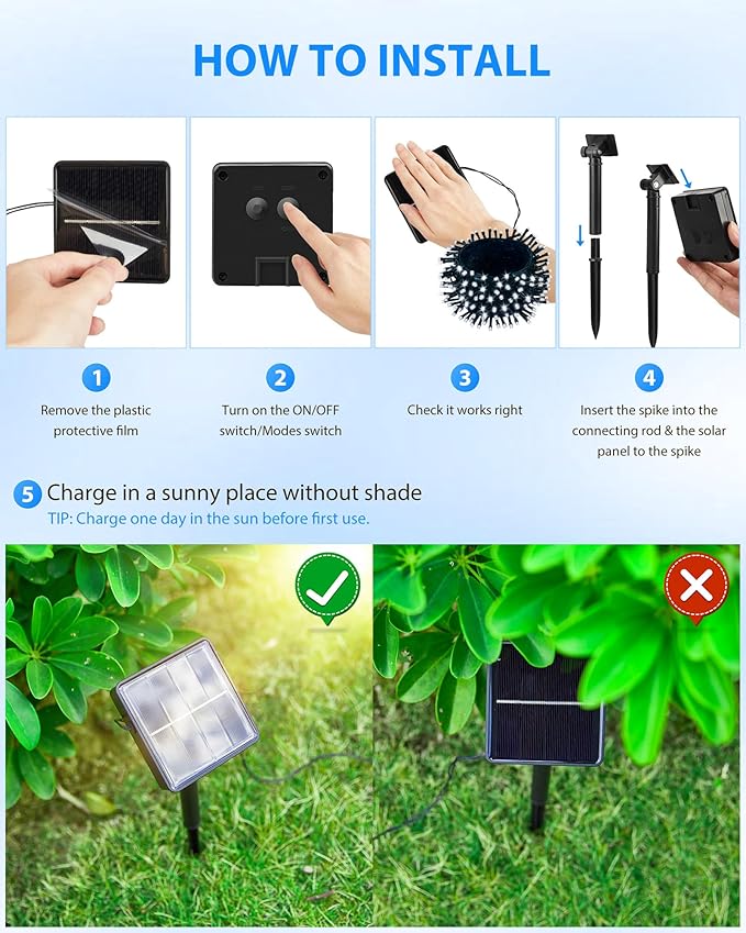- 【Auto On/Off & Easy Installation】Solar outdoor lights fully charged under direct sunlight for 4-6 hours, they can work up to 8-10 hours at night, the outdoor solar lights automatically turn on at dusk and auto off at dawn. Also, solar outdoor string lights with ground stake is easy to install, just stake into the ground, and our string lights have soft light cords, very suitable for DIY any shape.