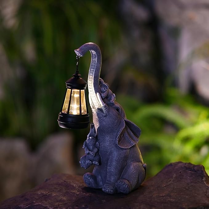 - Unique Design : The solar elephant statues have a cute design, the Elephant sits tactfully and two elephant baby rests on the Elephant's nose, make the statue lively and vivid. The elephant decor with a solar lantern light for outdoor lighting. It adds nature and warmth to your home and garden.