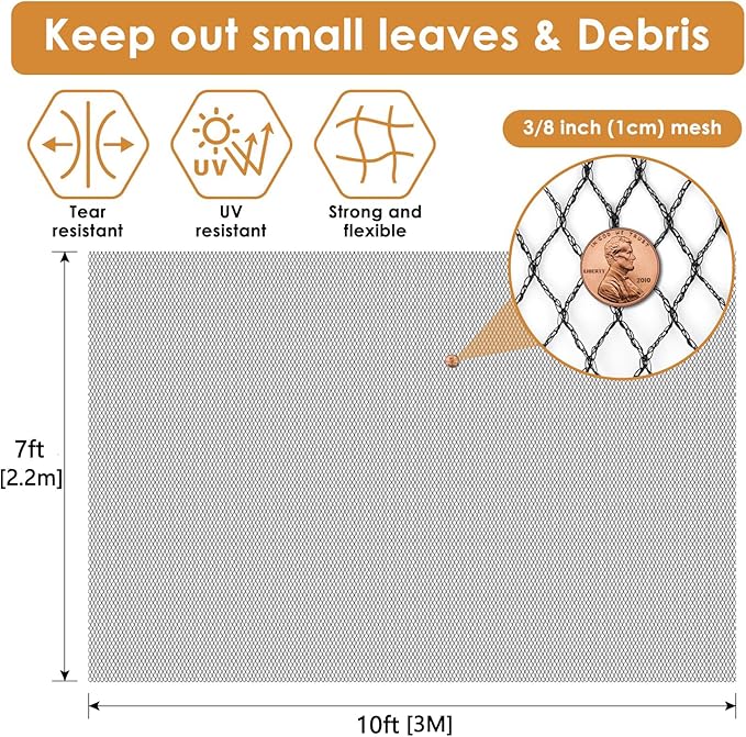 - ๐ฅ๐ฒ๐น๐ถ๐ฎ๐ฏ๐น๐ฒ ๐๐ถ๐๐ต ๐ฃ๐ผ๐ป๐ฑ ๐ฃ๐ฟ๐ผ๐๐ฒ๐ฐ๐๐ถ๐ผ๐ป - 3/8 inch SMALL mesh size leaves pond netting can be effective prevents the leaves,branches and debris from falling into the ponds and keep the water be clear and healthy. Also protect your goldfish and koi fishes against birds, cats, and other predators.