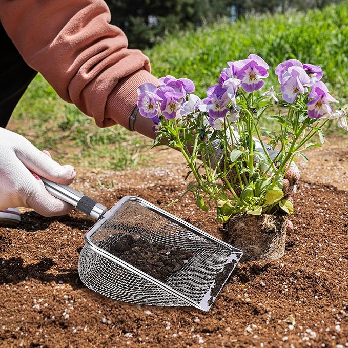 - Utility design:Garden mesh sieve shovel has a hanging loop for easy storage after your use. The handle is ergonomically designed to be easier to use than traditional round sifters, ensuring a more comfortable experience for you.