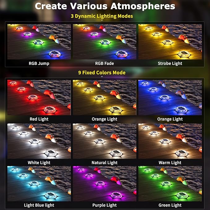 - 【12 Lighting Modes】We have upgraded these solar dock lights from the previous single-color mode to 9 fixed color modes and 3 dynamic light modes. It can be used as a warning step lights, LED driveway markers to prevent accidents, or as an atmosphere light decoration, which greatly broadens the use scenarios.