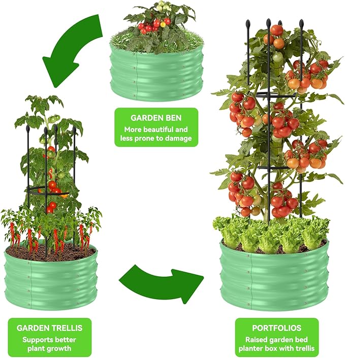 - 【Raised Garden Bed with Trellis】Raised garden bed kit equals 3 products contains: raised garden bed, tomato cage, garden bed and tomato trellis combination. With our perfectly matches combo set, great for protecting plants during their seedling, growing and maturing stages, perfect for customizing your own garden!