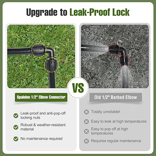 - Enhanced Locking Mechanism for Leak Prevention: Unlike 1/2" drip irrigation elbow connectors without locks, our 1/2 inch drip irrigstion fitting elbow connector feature a twist-lock mechanism that prevents tubing from popping off under high water pressure. The combination of a barbed design and locking system ensures a tight, stable connection that won’t loosen over time. Enjoy a secure, leak-proof drip irrigation system without the hassle!
