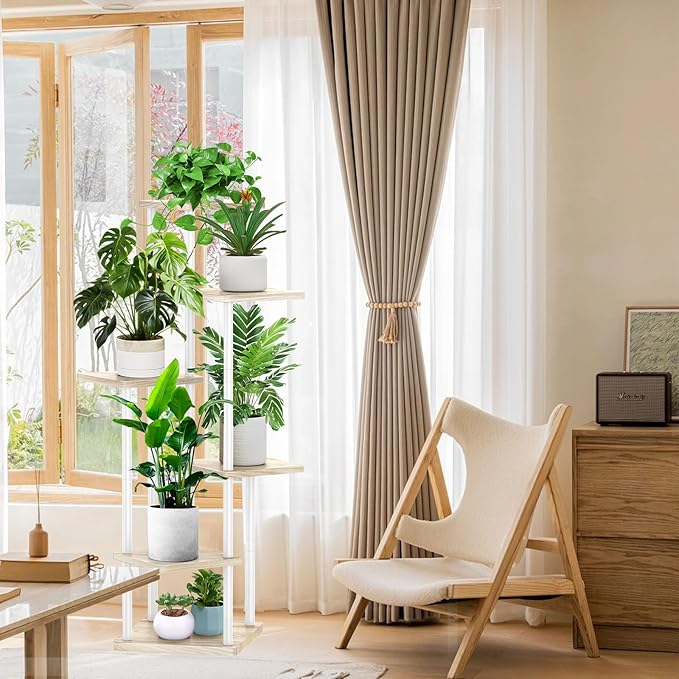 6 Tier Wood Tall Plant Stand Metal Rack Indoor, Multiple Flower Pot Holder Shelves Corner Rack, Planter Shelf Display Rack Storage Organizer for Patio Living Room Balcony Garden(White Oak)