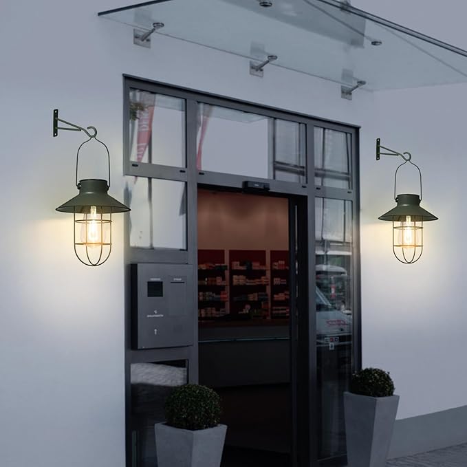 - 【Perfect Shape】 -- New color marsh green farmhouse lantern style design + warm LED Tungsten light bulb. Antique hanging solar lantern and farmhouse style design, Warm White LED Solar Lantern with wall mount kits, can be mounted anywhere you want, perfect for garage, porch, fence, or wall, It can also be used in conjunction with a sheep hook, light for garden, yard, pathway, driveway, lawn, camping, etc.