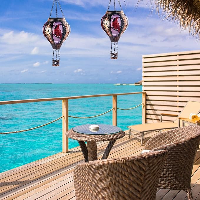 - 【Unique Hot Air Balloon Design】--This hanging solar light is composed of 4 pieces of cardinal glass and 4 pieces of hollow out metal with lifelike flame lights. As night falls, their glow adds warmth and comfort to your garden, patio, yard, path, and more, great Christmas and holiday decorative lights.
