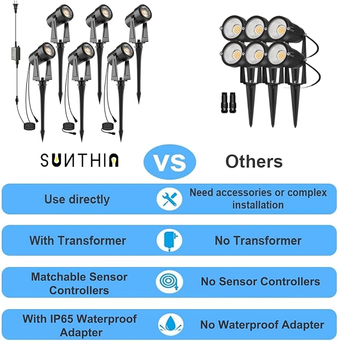 SUNTHIN Outdoor Landscape Lighting, 6 Pack Outdoor Spot Lights with Transformer for Yard, Plant, Lawn, Tree, Flags, House, Garden, Fence Use, IP65 Waterproof & Connectable