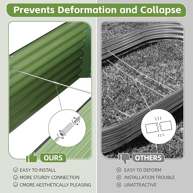 - 【 Superior Durability 】Made of 0.7mm thick zinc-coated steel with spray coating, our raised garden bed resists rust, corrosion, and deformation for 5x longer lifespan than thin competitors. Dual-folded edges ensure galvanized garden bed structural stability even in harsh weather.