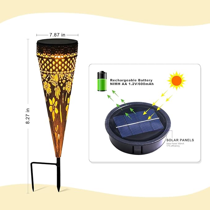 - Long-endurance Solar Power -The outdoor landscape lighting is topped with high-efficiency solar panel; it collects sunlight to charge 6 hours during the day and light up (make sure turn on the switch) at least 8 hours in darkness. Besides, with its waterproof rating of IP65, the solar lantern can work on rainy days as well