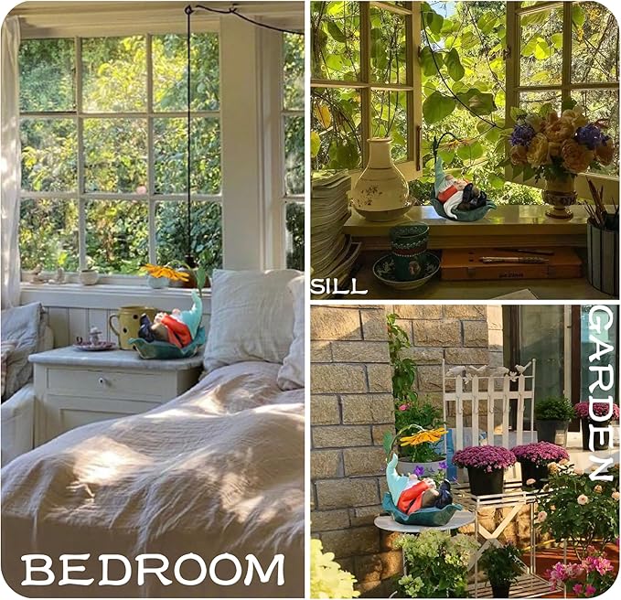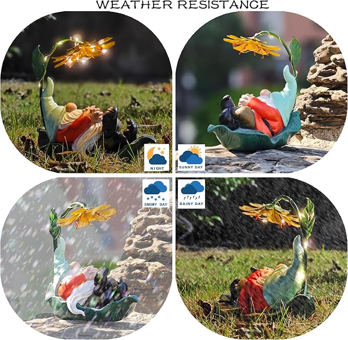 - 【Charming Design】: This whimsical resin gnome lies on a large green leaf, wearing a light-green hat and using a big yellow stamen as a sunshade. Its decorative, funny face and artistic details add a heartwarming touch to any garden or flower bed.