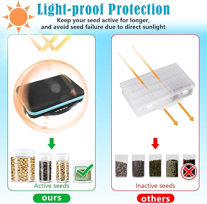 - Multiple Protection: All seed organizer boxes are seated securely in sponge holes to avoid collisions between boxes. Compared to large plastic boxes, the high-quality zipper bag can provide more cushioning and is not easily damaged. And seed organizer bag can provide light-proof protection, allowing them to maintain vitality for longer