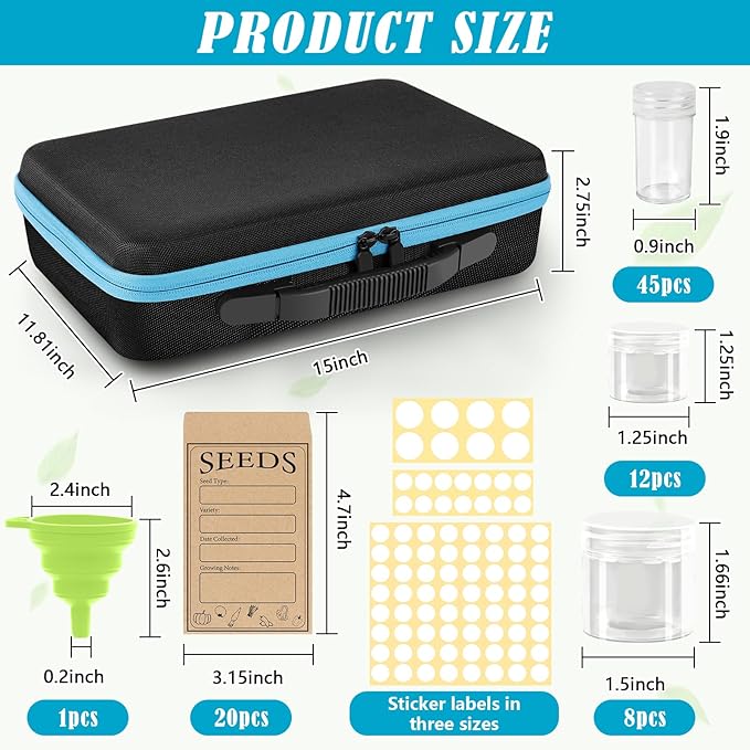 - Easy To Place: Provides 3 storage boxes of different sizes to meet different sizes and quantities seed needs. Each with a large entrance for seeds, and comes with a silicone funnel for easy placement of seeds. The lid of the rotary closure design ensures that it will not pop open and seeds are not scattered everywhere. Self adhesive seed envelopes are very convenient for storing large amounts or large particles of seeds, which can then be placed in the pocket on the inside of the zipper bag