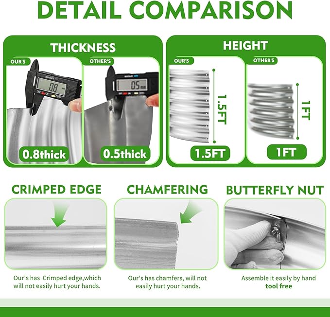- Materials and Construction: The raised garden bed kit is constructed with sturdy metal 0.8mm thick, providing a reliable framework for your garden.The round-shaped design adds a unique aesthetic,and the 17" height provides ample depth for plants
