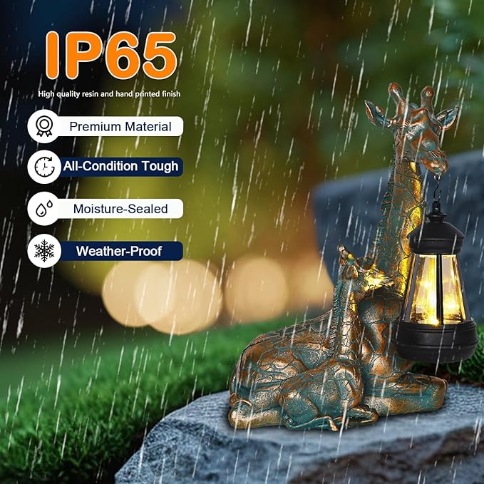 - Solar Giraffe Garden Statue:This charming solar giraffe statue features a mother giraffe holding a lantern,with a baby snuggled by her side.The scene is warm and full of love,symbolizing family and companionship.The design is simple yet artistic,bringing a cozy and natural ambiance to your garden.
