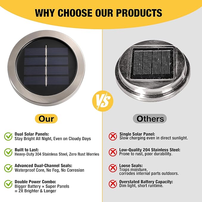 - 《Double the Sun, Double the Shine》Upgraded with dual solar panels—like giving energy wings to your garden lights. Paired with a true 600mAh battery, it delivers 50% longer illumination than single-panel models. From backyard BBQ kickoffs to the last ember of your bonfire, your steak dinner will never be without warm, ambient glow.