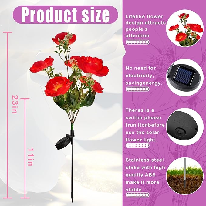 - Bring your garden to life with QINGYA Newest Version Vivid Outdoor Solar Garden Decor Lights! These decorative LED flowers are perfect for adding a touch of color and elegance to any outdoor space. Whether you're entertaining guests, enjoying a quiet evening under the stars, or just relaxing with a good book, these elegance lights provide the perfect ambiance.