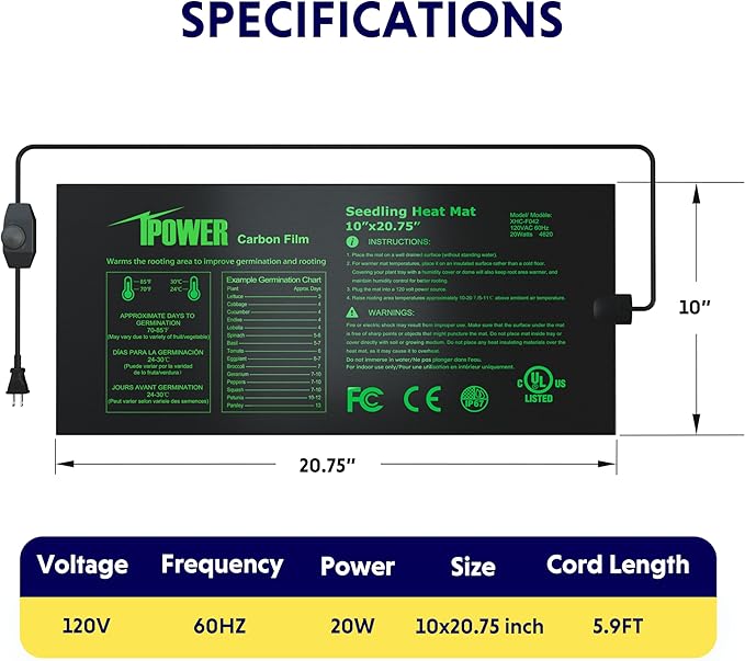 - Specifications: size: 10 X 20.75 inch; voltage: 120V; frequency: 60Hz; power: 20W. Package Included: 2 pack seedling heat mat with temperature adjustable knob