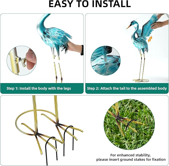 - Oversized Whimsical Crane Design: Our metal crane garden statue, inspired by a graceful crane couple, is a show - stopper. With dimensions of 14L X 24"W X 35.5"H and 10.5"L X 7.5"W X 36.75"H, these oversize crane sculptures bring natural charm and a touch of elegance to any space, be it your garden, yard or lawn."