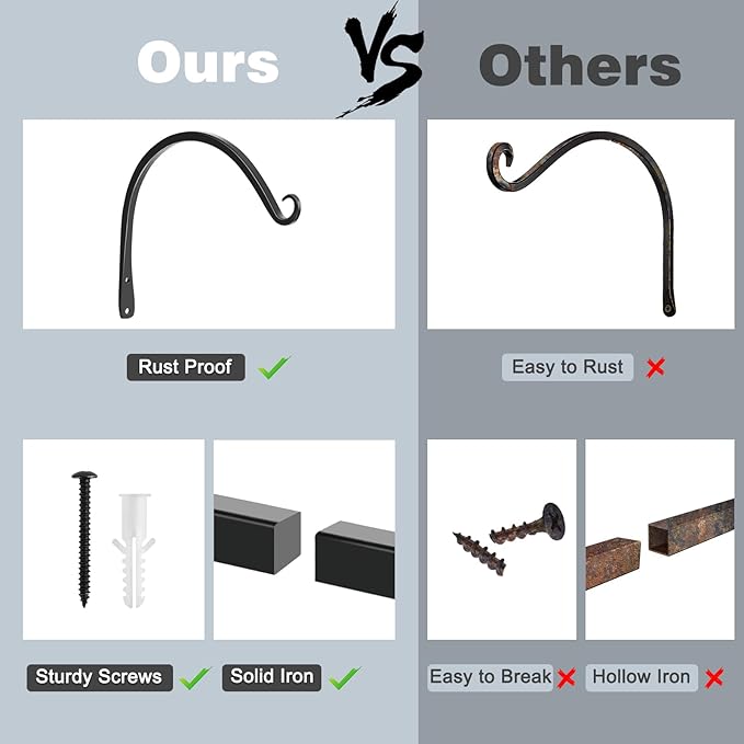 - Size & Quantity: The length of the plant hanging bracket is 10 inches, and the height is 5.5 inches. Each package includes 2 hanging plant hooks and 4 metal screws. The hanging basket hooks are made of heavy steel and coated with anti-rust material on the surface. They are stable, durable, and guaranteed