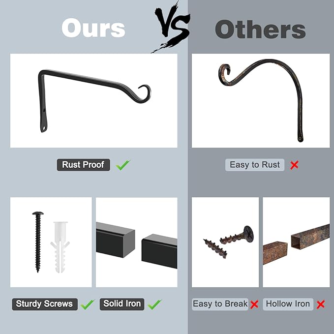 - Excellent Technology: These bird feeder hooks adopt high quality solid metal structure, which is firm and not easy to bend. The surface of our hooks for hanging plants outside is coated with black coating, which is rust proof and durable. You can fix plant hanger bracket on the outdoor wall of your house without worrying about wind and rain